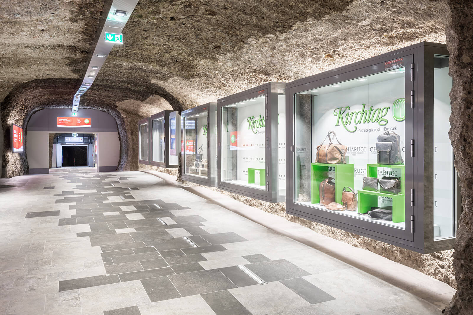 Das innovative Beleuchtungskonzept, das im Vorjahr bereits beim Zugang Bürgerspital umgesetzt wurde, sorgt jetzt auch beim Zugang Neutor – Herbert von Karajan Platz für eine helle und zugleich ästhetische Atmosphäre. Für die Sanierung der Gänge sowie für den Bau der E-Ladestationen und viele weitere Optimierungen werden über 1,9 Mio. Euro investiert.